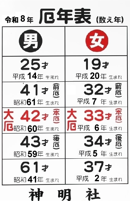時代によって多少の変化はありますが、厄年とする年齢は一般には数え年で男性は25歳、42歳、女性は19歳、33歳、37歳です。中でも男性の42歳と女性の33歳は「大厄」といい、その前後の年齢も「前厄」「後厄」とされ忌むべき年齢といわれています。現在では男女の61歳も厄年とされている場合があります。元来は「還暦」としてめでたい年なのですが、平均寿命が延びた現在は厄年と節目の厄年といわれるようです。